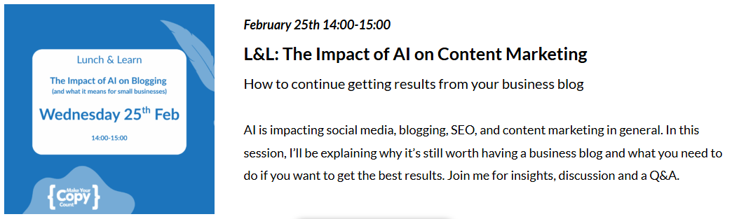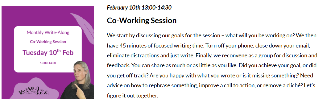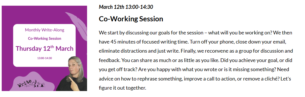 Every month, I host two live online events: a co-working session and a lunch and learn with Q&A. You can book any of these events on a pay-as-you-go basis for just £15 per session. Alternatively, join my membership and get access to both monthly events for £20 per month.