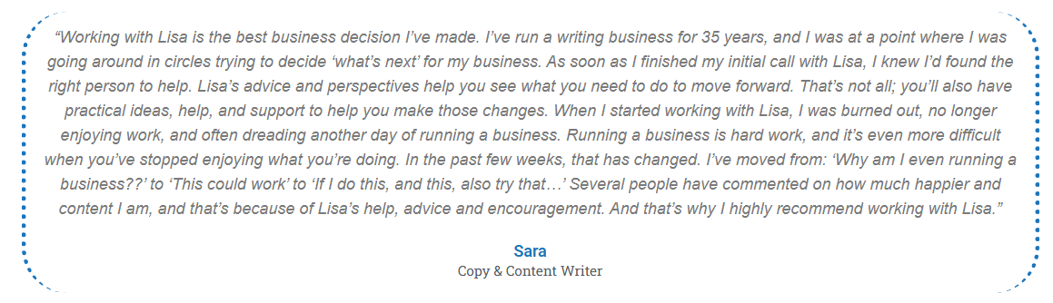 You’ll have someone in your corner with you. I’ll be your sounding board. I’ll help you work through decisions. I’ll celebrate your successes with you and pick you up when you’re having a bad week. Plus I’ll give you a kick up the arse when you need it.